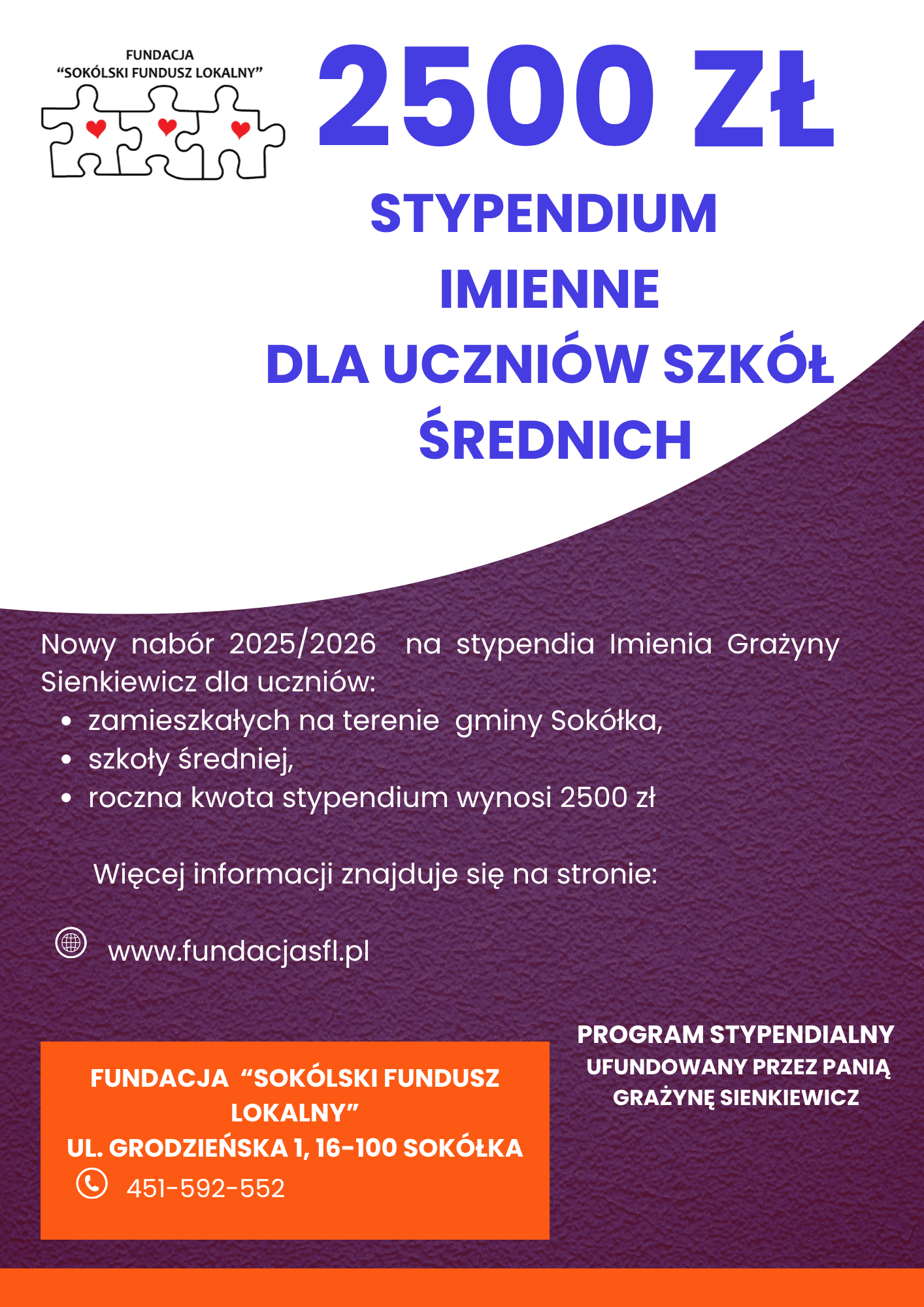 Zarząd Fundacji „Sokólski Fundusz Lokalny” ogłasza nabór na stypendium Imienia Grażyny Sienkiewicz dla..
