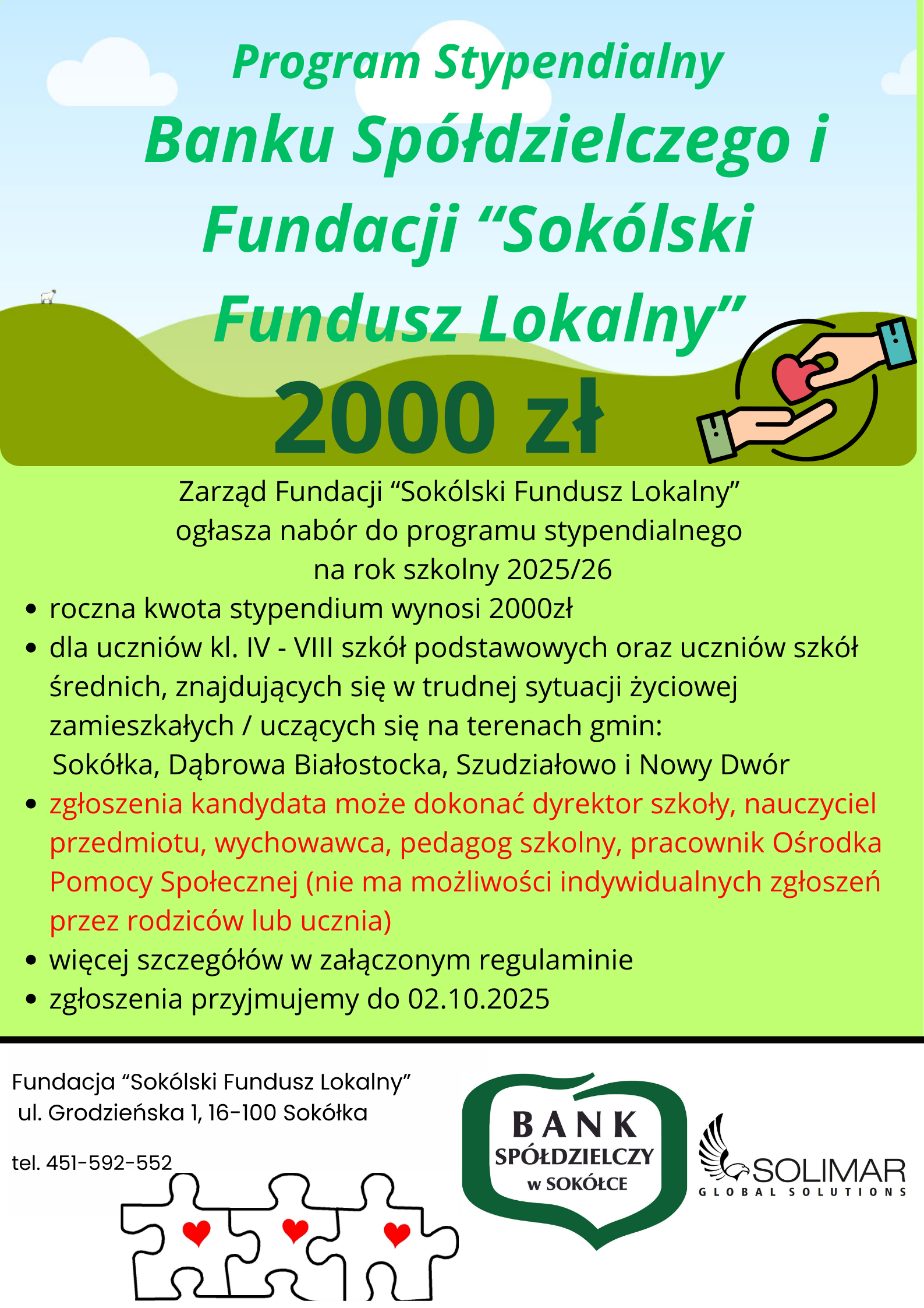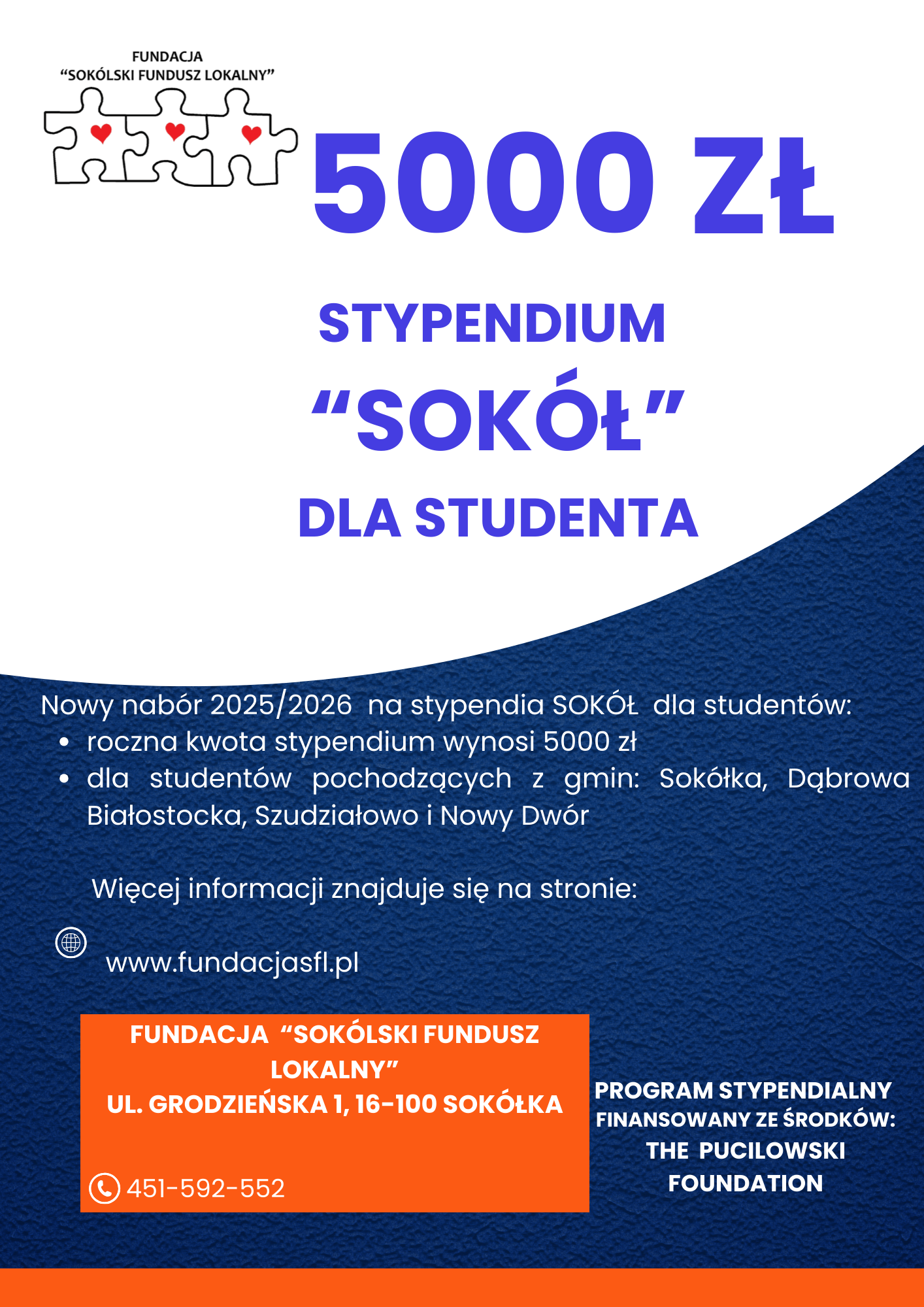 Zarząd Fundacji "Sokólski Fundusz Lokalny" przedłuża termin naboru wniosków na stypendia Sokół FORMULARZE NALEŻY..