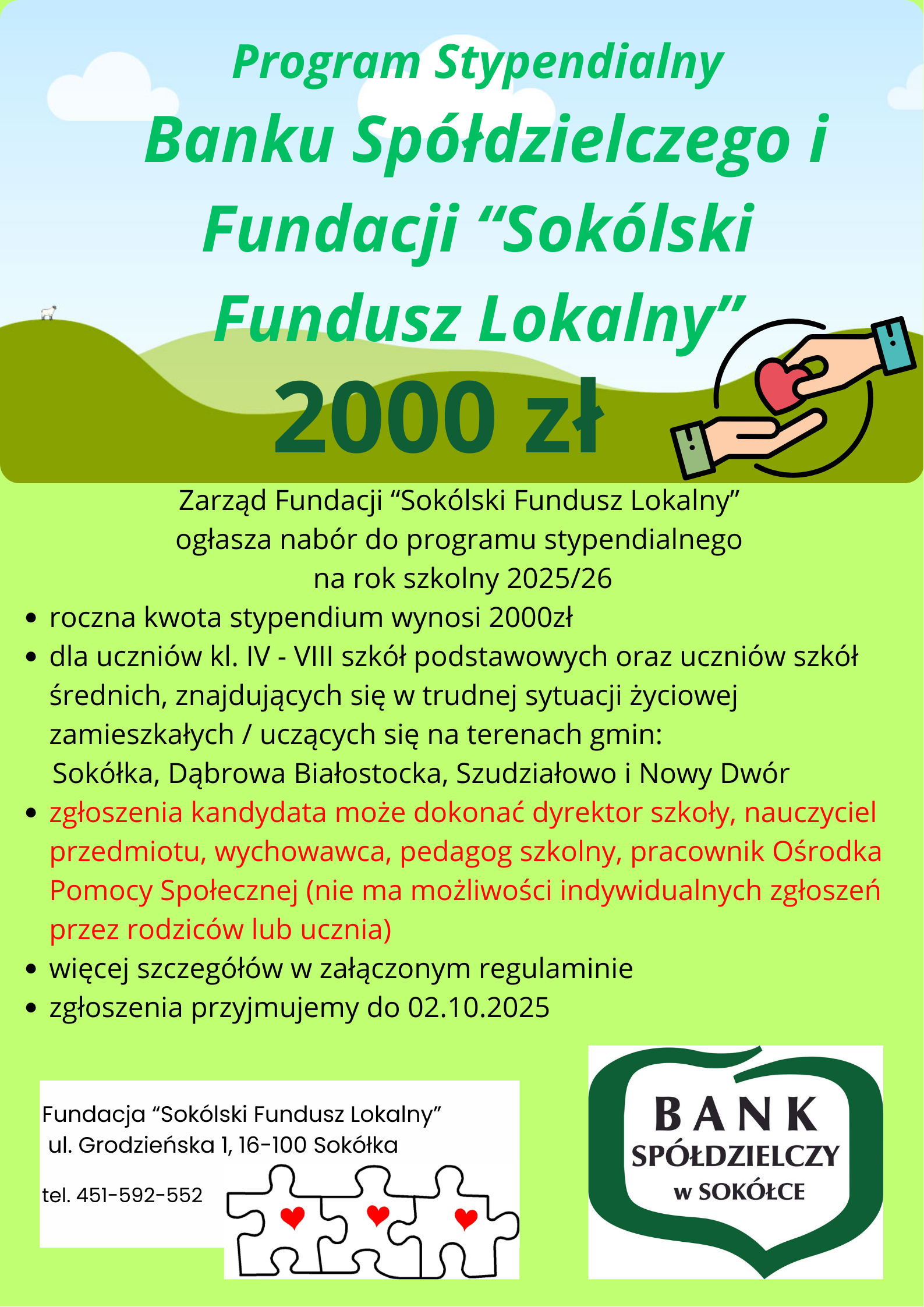 Zarząd Fundacji "Sokólski Fundusz Lokalny" przedłuża termin naboru wniosków na stypendia Sokół FORMULARZE NALEŻY..