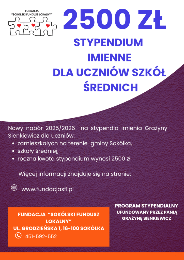 Zarząd Fundacji „Sokólski Fundusz Lokalny” ogłasza nabór na stypendium Imienia Grażyny Sienkiewicz dla uczniów szkół średnich- 1 stypendium x 2500zł